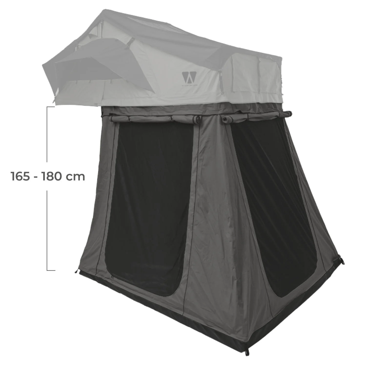 Das neue niedrige Vorzelt für das BIG WILLOW ist eine vielseitige Ergänzung zu Deinem Dachzelt und bietet Dir einen überdachten Einstieg. Es passt nahezu für jeden normal hohen PKW, da es über das smarte Zip-System in der Höhe eingestellt werden kann (165 – 180 cm). Mit dem Vorzelt hast du die Option, Dein BIG WILLOW um zusätzlichen Lagerplatz, weitere Schlafplätze oder einen geschützten Aufenthaltsbereich zu erweitern.